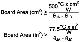 所需的PCB板面積近似值未考慮到散熱孔所發揮的作用,這些散熱孔將熱量從頂部金屬層(封裝連接至PCB)向底部金屬層傳遞。底層用作第二表面層,對流可以從這里將板上的熱量傳送出去。為了使板面積近似值有效,需使用至少8~10個散熱孔。散熱孔的熱阻近似于下列方程式值。
