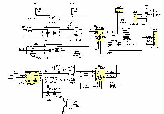 本文設計的接口電路主要是針對工業現場控制終端,由于各種控制要求不同,所以對控制終端的配置各異。但總體要求是某一終端故障不應影響系統其余部分的功能,要便于終端與監控系統之間的接口。所以,本文設計中對于RS-485與RS-232的轉換采用了無源的轉換方式,而非常規的RS-232與RS-485標準轉換,既便是與PC相連的終端單元掉電,也不會影響系統中其它單元的正常通信。
