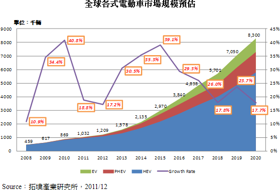 2020年前全球新能源車市場成長動(dòng)能主要以油電混合車(Hybrid Electric Vehicle;HEV)為主,預(yù)計(jì)目前仍為全球電動(dòng)車銷售上升主力,約占整體電動(dòng)車市場70%。2011年后隨著鋰電池技術(shù)漸趨成熟,插電式油電混合車(Plug-in Hybrid Electric Vehicle;PHEV)市場逐漸起飛,2012年起將呈顯著成長,2020年銷售量將達(dá)150萬輛,占整體電動(dòng)車市場的18%,而完全仰賴電池做為動(dòng)力來源的純電動(dòng)車(Battery only Electric Vehicle;BEV),由于各國政策推動(dòng)期程不一,現(xiàn)仍處于示范運(yùn)行階段,預(yù)計(jì)2020年占整體電動(dòng)車市場的12%。