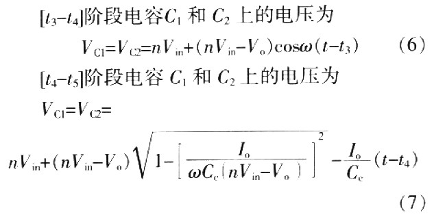 兩端電壓從零開始諧振增大,在半個諧振周期后達到最大值VC1max=VC2max=2nVin-Vo,此時模態2結束。模態2中,VD5=VD6=0,VD7=Vo。二極管D2、D3兩端反向電壓從V0逐漸增大VD2=VD3=4nVin-V0。