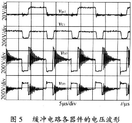 圖5給出了緩沖電路各器件的電壓波形,波形從上往下依次是vgsl、vC1、vD7、vD5。當任何一個開關管開通時,緩沖電容充電,抑制了關斷整流管的電壓尖峰;當任何一個開關管關斷時,緩沖電容給負載釋放能量,然后4個整流二極管均導通續流。整流二極管和緩沖二極管上振蕩周期均為