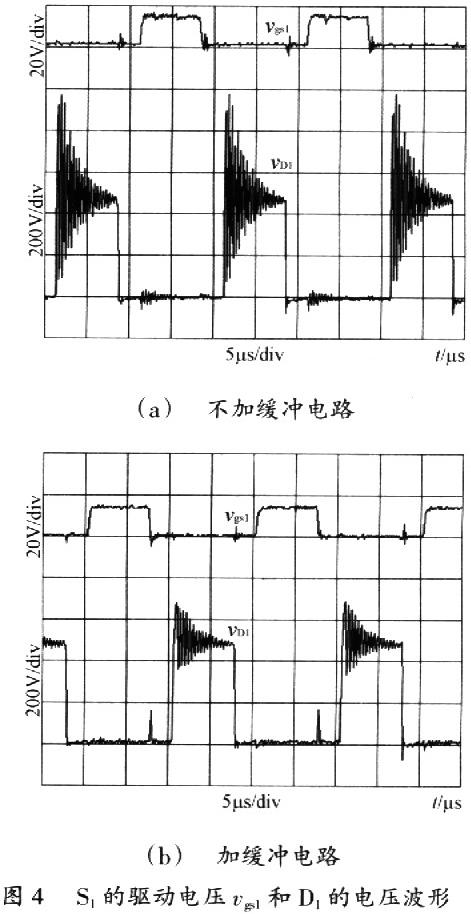 圖4(a)和圖4(b)給出了在額定輸入27V、輸出l 000W時,不加緩沖電路和加緩沖電路時整流二極管vD1的電壓波形。從實驗波形中可以看出,加緩沖電路后,vD1的電壓尖峰減小了300V左右,表明緩沖電路對整流二極管的電壓尖峰具有很好的抑制作用。圖4(b)中,S1關斷后,在4個整流管都續流前,vD1波形有一小段突起,對應的是緩沖電容C1和C2給負載放電的過程。