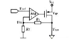間接閉環(huán)控制環(huán)路如圖1所示,該控制環(huán)路包括一個誤差放大器,反饋環(huán)路和調(diào)整管(VMP管)。工作原理是由誤差放大器將輸出反饋電壓VFB與參考電壓Vref進行比較,并放大其差值(Vref-VFB)以此來控制調(diào)整管(VMP)的導通狀態(tài),實現(xiàn)負反饋,從而得到穩(wěn)定的輸出Vcon。電路剛啟動時,反饋電壓VFB很低,如果穩(wěn)壓器啟動時產(chǎn)生較大的電容(或者負載電容很大)或VMP管導通時有較小的電阻,浪涌電流(即流過VMP管的瞬間電流)就會很大,有時會接近穩(wěn)壓器的電流限值。因此,必須在誤差放大器中設計軟啟動電路,以保證整個電路在上電后進入正常的直流偏置狀態(tài),不會產(chǎn)生浪涌電流。