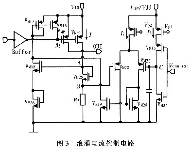 由上面分析可知,由于N2節(jié)點電壓迅速變化,導致大的浪涌電流流過P功率管(VMP管)。因此只需要控制N2節(jié)點電壓的變化就可以實現(xiàn)電流的控制,控制該浪涌電流變化無非就是控制其變化的斜率和峰值。其具體的電路原理圖包括兩個部分,即浪涌電流的斜率控制部分和峰值控制部分。具體的實現(xiàn)電路如圖3所示。