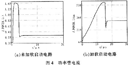圖4為系統(tǒng)剛啟動時,流過功率管VMP管的電流,圖4(a)為沒有加軟啟動電路時,流過P功率管的瞬態(tài)電流,其峰值電流高達1.45 A。圖4(b)表明軟啟動電路分別從斜率和峰值成功地控制了瞬態(tài)電流,其峰值僅為520 mA,上升的斜率幾乎是一恒定值,不過這會增加系統(tǒng)的響應時間。因此可以根據(jù)應用系統(tǒng)的其他要求確定浪涌電流的斜率和峰值。