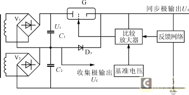 輸入400Hz/220V電源,經高壓變壓器升壓變換后,輸出兩路交流高壓分別送入兩組整流器及濾波器,其中一組作為收集極電壓(Uc=15~18kV,Ic=85mA,而不需要專門做收集極高壓,這是該電路的獨特之處)送入行波管收集極。另外,將整流濾波后的兩組直流電壓串聯,經調整管G穩壓后輸出穩定度很高的直流電壓(UA=20~25kV,Ia≥15mA,穩壓可調)給行波管的同步極。在調整管G的陰極和兩整流器串聯點之間接一個高壓硅柱D3,對調整管G構成過壓保護電路,調整管G出現的最高電壓就是整流器V1空載時的輸出電壓。所以調整管G可以選耐壓很低的管子。同時濾波電容C1、C2的耐壓也相應降低了,因而大大減小了體積和重量。特別是消除了兩組電壓因充放電不一致引起高壓差而打火。