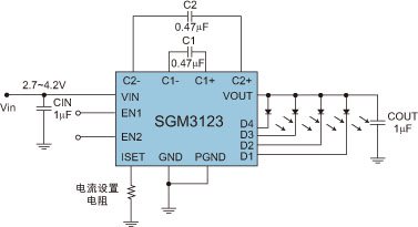 圖2:恒流模式電荷泵SGM3123的典型應用線路。