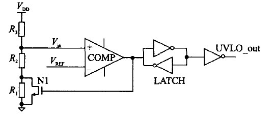 時,比較器開始跳變,N1關斷,UVLO-out為0,使能整個控制芯片。當外部電源電壓開始減小到: