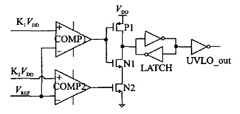 圖2給出第一種欠壓鎖定電路的原理圖,稱為U-VLO1,這是用兩個比較器實現的欠壓鎖定電路。VDD是外部供電電壓源,K1、K2 是小于1的常數,且K1>K2,VREF為1.25 V帶隙基準電壓,LATCH是由兩個反相器組成的鎖存器。圖中標的UVLO_out代表欠壓鎖定信號,狀態(tài)設置是UVLO_out=0時有效。