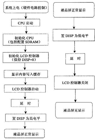 液晶顯示器啟動(dòng)、關(guān)閉的測試流程圖如圖6。其中LCD控制器的初始化最為重要,須依照液晶顯示模塊的要求配置CPU的寄存器和延時(shí)時(shí)間。