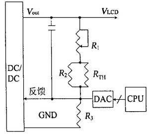 液晶顯示器對(duì)比度的調(diào)節(jié)可分為硬件調(diào)節(jié)和軟件調(diào)節(jié)。圖5的電路具有軟、硬件調(diào)節(jié)功能。其中R1是可調(diào)電阻,可調(diào)節(jié)VLCD的電壓,從而液晶顯示器的對(duì)比度得到調(diào)節(jié);電路中還可利用CPU與數(shù)模轉(zhuǎn)換器(DAC)相結(jié)合來控制DC/DC的反饋端的電壓,從而實(shí)現(xiàn)軟件調(diào)節(jié)液晶顯示器的對(duì)比度。