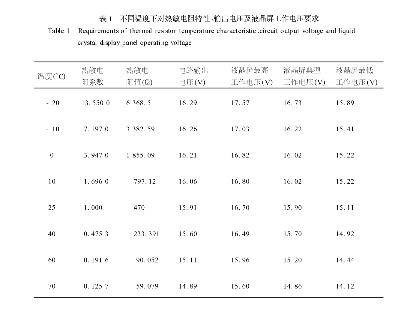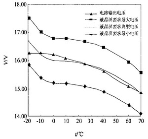 進(jìn)行了模擬計(jì)算,結(jié)果如表1,由表1所得曲線如圖4。表1和圖4表明電路輸出和液晶屏的要求吻合,電路能夠保證液晶在-20~70°C 范圍內(nèi)正常顯示。而且高、低溫測試結(jié)果證實(shí),在-20~70 °C范圍內(nèi)對(duì)比度正常。