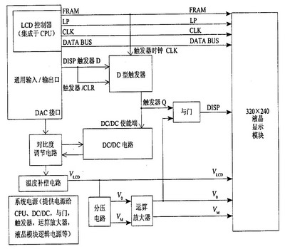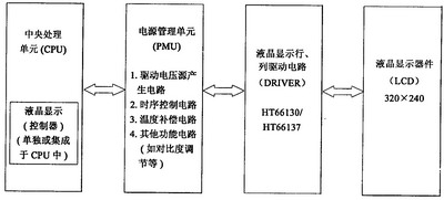 實(shí)現(xiàn)液晶顯示須具備4個(gè)單元,其框圖如圖1所示。本文給出的電源管理電路設(shè)計(jì)方案具有驅(qū)動(dòng)電壓產(chǎn)生、時(shí)序控制、溫度補(bǔ)償和對(duì)比度調(diào)節(jié)的功能,其框圖如圖2所示。