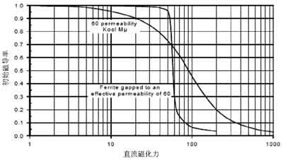 此外,電感磁芯材料也是選擇電感時應該加以考慮的重要因素。常用的磁芯材料分為兩大類,一類是粉狀磁芯,以鐵粉芯、High Flux高磁通磁粉芯以及Kool Mμ為代表;另一類是鐵氧體磁芯。兩種磁芯材料各有優缺點,設計人員在選擇的時候,應根據成本、性能、尺寸等因素綜合考慮進行選擇。相對粉狀磁芯電感,鐵氧體磁芯的電感具有較低的磁芯損耗,同時具有較高的開關頻率(高達MHz)。因此,鐵氧體磁芯通常是此類應用的最佳選擇。當然,鐵粉磁芯也有其優越性,例如鐵粉磁芯的成本相對鐵氧體要低得多;另外,粉狀磁芯的電感隨著流過電感的直流偏置電流的變大要下降得緩慢些,相當于具有“軟”飽和特性,而鐵氧體磁芯的電感值在飽和以后就會迅速下降(見圖1),因此在設計的時候需要留有更多的余量,防止電感出現飽和。如圖1所示,粉狀磁芯的電感值隨著負載電流的增大下降相對緩慢。鐵粉磁芯往往是用于一些對功耗要求不甚敏感,開關頻率也不高(<200kHz),但注重成本的應用場合。