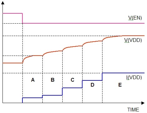 在A部分,通過限制流過分斷開關的電流來減少負載電容充電時的浪涌電流;在B部分,升壓轉換器的開始電流限制在25%;在C部分,電流限制設在50%;在D部分電流限制為75%;在E部分,電流限制為100%。