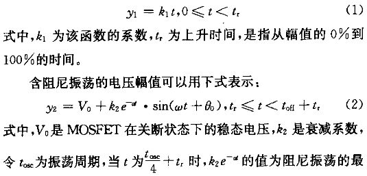圖1中展示了一MOSFET的漏源極電壓波形,為了研究其上升時間、下降時間、阻尼振蕩等對其頻譜的影響,需要確定該波形的特征參數(shù),然后運用Matlab編程仿真。由于該波形是由一個梯形信號和一個阻尼振蕩信號疊加而成,因此可以用分段函數(shù)進(jìn)行模擬。上升沿可以用式(1)表示。
