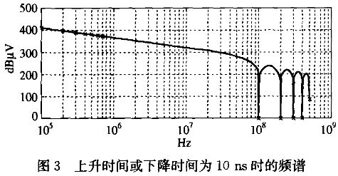 開關(guān)信號的上升和下降沿對干擾的幅值影響很大,圖3是上升時間或下降時間為10ns時的上升沿或下降沿的頻譜,把上升時間或下降時間改為100ns再仿真時發(fā)現(xiàn):當(dāng)上升時間或下降時間增加時,隨著頻率的升高,幅值減小的越快,也就是說,上升或下降時間的變化對高頻干擾幅值影響更大。表1中列出了上升時間或下降時間為10ns和100ns時,不同頻率的電磁干擾幅值和比較結(jié)果。從圖中還可以看出在頻率為及其諧波頻率附近,電磁干擾的幅值有一個很大的下降。