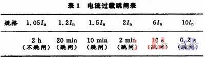 在漏電防火控制系統中,電流過載跳閘時間表見表1。