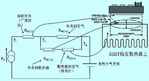 圖2中:rθ(j-c)是器件結(jié)到管殼基準(zhǔn)點穩(wěn)態(tài)熱阻,由制造廠家提供,一般在數(shù)據(jù)表中給出上限值或給出瞬態(tài)熱阻曲線取t→∞的穩(wěn)態(tài)值;rθ(c-a)是管殼未通過散熱器直接到空氣的熱阻,通常不考慮;rθ(c-s)是管殼到散熱器的觸熱阻,通常由制造廠家在數(shù)據(jù)表中給出;rθ(c-a)是散熱器基準(zhǔn)點到環(huán)境基準(zhǔn)點的熱阻,其值由散熱器形式、尺寸和冷卻方式?jīng)Q定;ta是環(huán)境溫度。