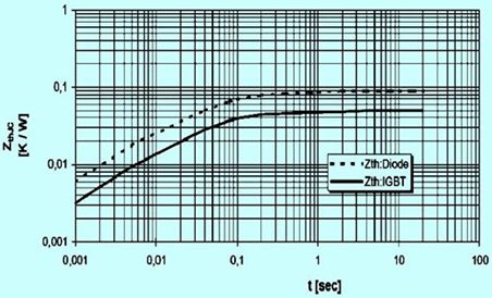 通常處于周期性脈沖功耗負(fù)載下的平均和最大結(jié)溫可以參考廠家所給出的瞬態(tài)熱阻曲線來計算。如圖3示出了eupc型號為bsm400ga120dlc的igbt模塊瞬態(tài)熱阻曲線zthjc=f(t)。