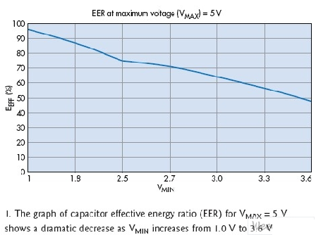其中EMAX代表電容器存儲的總能量。等式2明確表明,隨著我們通過減少電容器內的駐留電能,而降低了被供電電路的最低工作電壓VMIN,有效能效比可獲得極大地提升。對任何以電容供電的電路來說,能效比都是一個非常重要的設計考慮。
