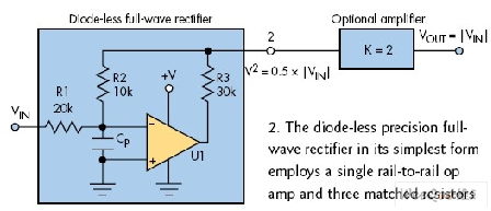 圖2:最簡單的無二極管精精密全波整流器采用單個軌至軌運算放大器和三個匹配的電阻。
