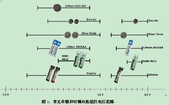 多數低端和中端便攜式產品都會使用可替換的電池或充電電池,這些電池還能由使用者自行更換。如圖1所示,剛充完電時的單節電池電壓通常會在1.2-1.6V之間,電力耗盡時則下降至0.9-1.0V。把兩個單節電池串聯即可提供1.8-3.2V之間的電壓。