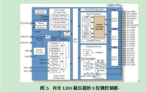 CMOS邏輯門的動態功耗可寫為:P = C × V2 × f,其中C為負載電容,它是設計和工藝技術的函數;V為供應電壓;f則是開關頻率,它是應用處理需求的函數。電源電壓是控制功耗的主要手段,因此若能像C8051F9xx內含低壓差 (LDO) 穩壓器一樣,直接在芯片中增加電壓轉換功能,就能提供穩定的1.8V電壓給微控制器的數字核心 (參考圖2),使動態功耗大幅下降。