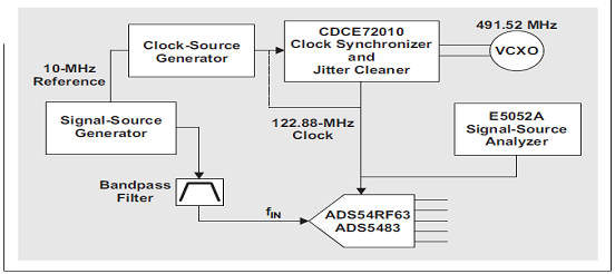 我們做了一個(gè)試驗(yàn),目的是檢查測(cè)得時(shí)鐘相位噪聲與提取自 ADC 測(cè)得 SNR 的時(shí)鐘抖動(dòng)的匹配程度。如圖 11 所示,一個(gè)使用 Toyocom 491.52-MHz VCXO 的 TI CDCE72010 用于產(chǎn)生 122.88-MHz 采樣時(shí)鐘,同時(shí)我們利用 Agilent 的 E5052A 來(lái)對(duì)濾波相位噪聲輸出進(jìn)行測(cè)量。利用一個(gè) SNR 主要受限于采樣時(shí)鐘抖動(dòng)的輸入頻率對(duì)兩種不同的 TI 數(shù)據(jù)轉(zhuǎn)換器(ADS54RF63 和 ADS5483)進(jìn)行評(píng)估。快速傅里葉變換 (FFT) 的大小為 131000 點(diǎn)。