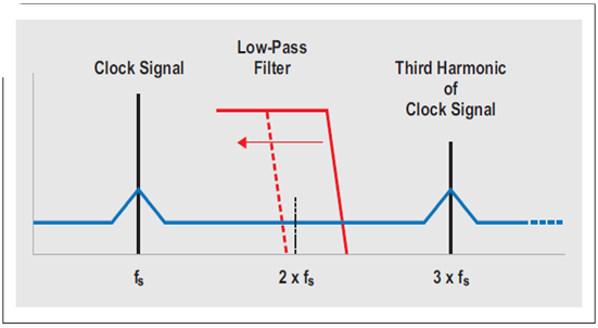 在采樣時(shí)間,基頻正弦波及高階諧波與輸入信號(hào)混頻,如圖 16 所示。(為了簡(jiǎn)單起見(jiàn),僅顯示了一個(gè)諧波。)因此,三階諧波周?chē)南辔辉肼暸c輸入信號(hào)混頻,而第三諧波也形成一個(gè)混頻結(jié)果。但是,由于時(shí)鐘信號(hào)的第三諧波的振幅更低,因此該混頻結(jié)果的振幅也被降低。