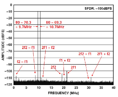 當輸入信號處于ADC滿量程范圍的幾dB之內時,IMD可能開始增加(但在設計優良的ADC中可能不會如此)。出現這種現象的確切電平取決于具體的ADC--有些ADC在其滿量程輸入范圍內,其IMD積不會顯著增大,但多數ADC會。當輸入信號繼續增加并超過滿量程范圍時,ADC應充當理想的限幅器,IMD積將變得非常大。出于對此類原因的考慮,ADC并無二階和三階IMD交調截點額定值。需要注意的是,DAC實際上存在同樣的情況。在兩種情況下,單音或多音SFDR(無雜散動態范圍)額定值是廣受認可的數據轉換器失真性能的衡量指標。