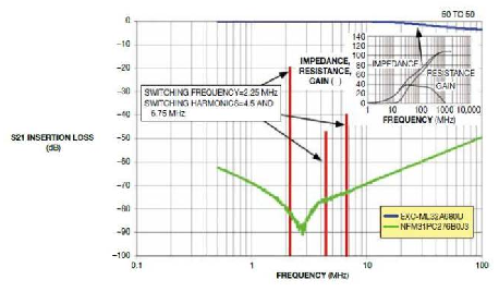 圖1,相比一個100 MHz時電阻為68Ω的傳統鐵氧體磁環,Murata公司的NFM31PC276B0J3 EMI有高的阻抗和低DCR.