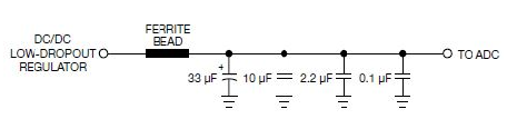 隔離來自ADC開關噪聲的一個關鍵元件是電源濾波器,它包括一個鐵氧體磁環和旁路電容。在選擇鐵氧體磁環時應考慮多個關鍵特性。首先,鐵氧體磁環必須有用于數據轉換器的充足額定電流,它必須有低的DCR(直流阻抗),以盡量減少磁環自身的壓降。例如,當一個200mA電源通過一個DCR為1Ω的磁環時,產生一個200mV的壓降。這個壓降可能將ADC上的電壓推至邊沿,考慮到電源電壓的標準差,ADC電壓甚至可能低于建議的工作電壓。