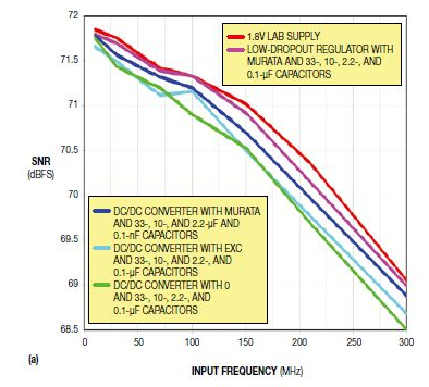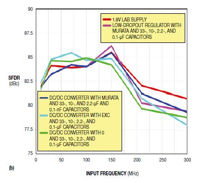 圖4,這些SNR(a)和SFDR(b)掃頻圖比較了一個用低壓差穩壓器的基準電源(如1.8V的實驗室用干凈電源),以及一個采用ADS4149評估模塊、有不同電源濾波器選項的DC/DC轉換器。