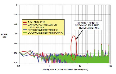 測試結果表明,在300MHz的中間頻率下,當用開關穩壓器供電時,SNR性能比低噪聲低壓差穩壓器下降了大約0.3dB.而各種方式的SFDR性能幾乎相同。通過仔細觀察正態化的FFT圖(開始于輸入信號,繪制的是噪聲與偏移頻率關系圖),表明當使用次優的EXC鐵氧體磁環時,整個Nyquist區中的背景噪聲略有升高,而沒有任何開關頻率饋入的跡象(圖5)。