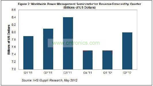 據(jù)IHS iSuppli公司的電源管理市場追蹤報告,繼2011年第四季度慘跌之后,電源管理半導體在2012年初有所回升,并在第二季度終于走上明顯增長之路,主要是受消費與工業(yè)領域的擴張推動。