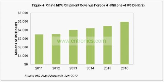 2012年中國MCU市場營業收入將達到35.3億美元,僅略高于2011年的34.9億美元。但是,到2016年,中國MCU市場將達到49.5億美元,預測期內的復合年度增長率為7.3%,如圖4所示。