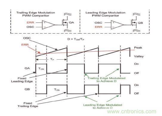 后沿脈寬調制比較器通過對比鋸齒電壓波形(OSC)和誤差電壓(ERR)來控制功率轉換器占空比(D)。一般,誤差電壓由一個反饋運算放大器控制。在后沿脈寬調制中,OSC引腳被饋送給脈寬調制比較器的負輸入,而誤差電壓則饋送至脈寬調制比較器的非反相輸入。脈寬調制比較器的輸出用于控制功率轉換器(QA)的FET柵極。該柵極驅動導通信號與OSC信號波谷同步。在這種配置結構中,FET柵極驅動的后沿經過調制,以達到功率轉換器占空比 (D)。該后沿為FET關斷時(請參見圖 1)。
