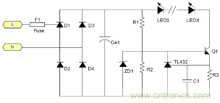 C1為降壓電容器, D1, 2, 3, 4為橋式整流二極管, ZD1是穩壓二極管, R1為關斷電源后C1的電荷泄放電阻。