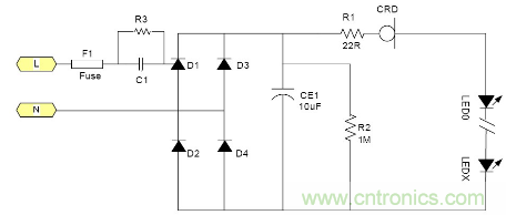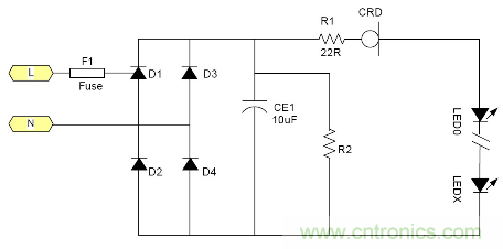 由于恒流二極管需要一定的電壓Vk才能夠進入恒流, 所以太低的電源電壓是無法工作的。通常這個Vk大約在5-10V左右 所以大多數采用電池供電的LED是無法工作的, 最大電流由于恒流二極管的功耗受到限制, 所以過大的電流也是不合適的。例如1W的LED通常需要350mA, 恒流二極管就很難提供, 目前比較合適的使用場合就是交流市電供電的LED燈具采用很多小功率LED串聯也就是高壓小電流的情況是最為合適;但是由于恒流二極管的耐壓有一定的限制 所以它所能吸收的電源電壓變化也是有限的。就拿100V耐壓的CRD來說用在220V市電電源里都還只能對付有限的電壓變化。220V經過橋式整流以后它的輸出直流電壓大約為264V.如果市電變化+10% ~-15%就相當于整流后為290~187V, 電壓變化103V.已經超過其耐壓了。因為LED伏安特性的非線性 所以很難用公式來表示。總之當市電電壓降低時LED中的電流就會隨市電電壓的降低而降低。其亮度也會跟著變。 典型應用電路中圖3為典型的應用電路, 圖4為加了阻容降壓的應用電路為了應對低電壓的輸出場合。