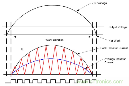 在半個輸入電壓周期內, 控制TON固定, 則電感電流峰值跟隨輸入電壓峰值, 且相位相同, 實現高功率因素PF, 有如下等式: