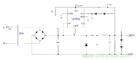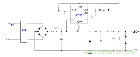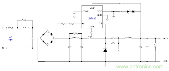 隨著目前法規和能效的需求, 針對LED應用提出高PF以及適應全電壓范圍都能可靠工作的要求, 并且朝小型化方面發展, 因此之前的填谷式的PFC電路也需要增加兩個高壓電容因體積的限制不太適合應用。有鑒如此, 國內外很多廠商都推出了適應球泡燈和T管之類的非隔離電源應用驅動方案, 下面就以通嘉科技的LD7832做為典型介紹。