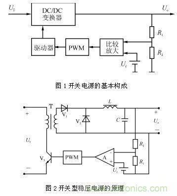 開關(guān)電源采用功率半導(dǎo)體器件作為開關(guān)器件,通過周期性間斷工作,控制開關(guān)器件的占空比來調(diào)整輸出電壓。開關(guān)電源的基本構(gòu)成如圖1所示,其中DC/DC變換器進(jìn)行功率轉(zhuǎn)換,它是開關(guān)電源的核心部分,此外還有起動(dòng)、過流與過壓保護(hù)、噪聲濾波等電路。輸出采樣電路(R1、R2)檢測(cè)輸出電壓變化,與基準(zhǔn)電壓Ur比較,誤差電壓經(jīng)過放大及脈寬調(diào)制(PWM)電路,再經(jīng)過驅(qū)動(dòng)電路控制功率器件的占空比,從而達(dá)到調(diào)整輸出電壓大小的目的。圖2是一種電路實(shí)現(xiàn)形式。