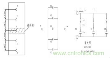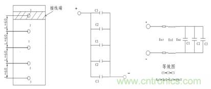 由圖6可知,同樣的器件,但是連接不同,其等效電路圖也不一樣。其條件同原有方案一樣,但其等效感抗不一樣。有等效電路圖可知,XL1=XL2=XL3=2πfL,而Esr和Esc三者數(shù)值相等,因此流經(jīng)每個電容的電流I=U/R=40A。這樣能使電流均勻地分布到每個電容上。這樣,就解決了電流分布不均而使電容部分電容發(fā)熱嚴(yán)重的問題。