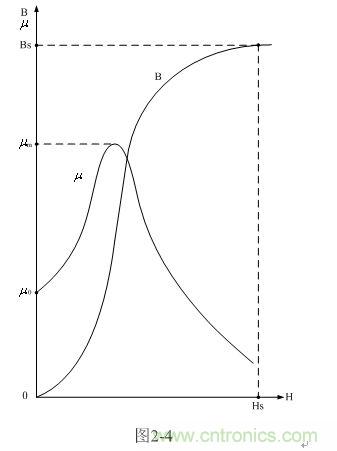 圖2-4是變壓器鐵芯導(dǎo)磁率和磁感應(yīng)強(qiáng)度對(duì)應(yīng)磁場(chǎng)強(qiáng)度變化的曲線圖。圖中,曲線B為磁感應(yīng)強(qiáng)度對(duì)應(yīng)磁場(chǎng)強(qiáng)度變化的關(guān)系曲線,曲線