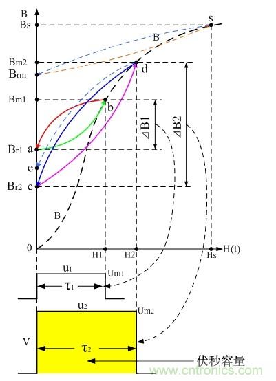 圖9是開關(guān)變壓器伏秒容量與磁場(chǎng)強(qiáng)度H、磁感應(yīng)強(qiáng)度B的對(duì)應(yīng)關(guān)系圖。圖中,脈沖幅度V總是與磁感應(yīng)強(qiáng)度的增量
