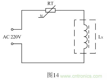 開關(guān)變壓器退磁的最好的方法是讓開關(guān)變壓器初級(jí)線圈在非常短的時(shí)間內(nèi)通過一個(gè)幅度為3~5倍Imax(極限電流)的阻尼振蕩電流。因此,可用一個(gè)20~40歐姆的消磁熱敏電阻(可用兩個(gè)消磁熱敏電阻串聯(lián))與開關(guān)變壓器的初級(jí)線圈串聯(lián),然后接到110~220V/50Hz交流電源上,大約只需要20多秒鐘,待消磁熱敏電阻完全加熱后,即可達(dá)到退磁的目的,如圖14所示。在圖14中,RT為熱敏電阻,Lx為開關(guān)變壓器的初級(jí)線圈。