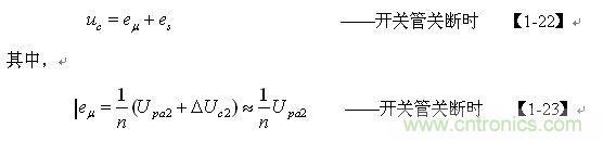 上面兩式中, uc為電容器C兩端的電壓, eu和 es分別為變壓器初級線圈勵磁電感 Lu和漏感Ls 產生的感應電動勢;Upa2為變壓器次級線圈N2反激輸出電壓的半波平均值,?Uc2為電容器C2兩端的紋波電壓,n為變壓器次級線圈與變壓器初級線圈的變壓比。