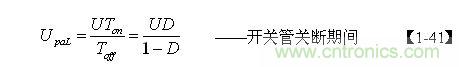 【1-41】式中,U為電源輸入電壓,Ton為電源開關管的導通時間,Toff為電源開關管的關斷時間,D為占空比。而Upau可根據漏感Ls 與開關變壓器初級線圈的電感L的比值k求得。