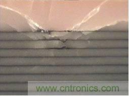 如圖3所示,斷裂通常沿著一層或兩層介質(zhì)層貫穿整個電容的中部。大多數(shù)的解決方案是將多個電容器通過添加引腳進行疊加,從而在給定尺寸下提高容值,但這需 要消耗大量人力,花費較多成本,并會產(chǎn)生可靠性問題。另外的解決方案使用特殊電介質(zhì)配方,但同時以犧牲介電常數(shù)作為代價,并影響最終可獲得的容值大小。